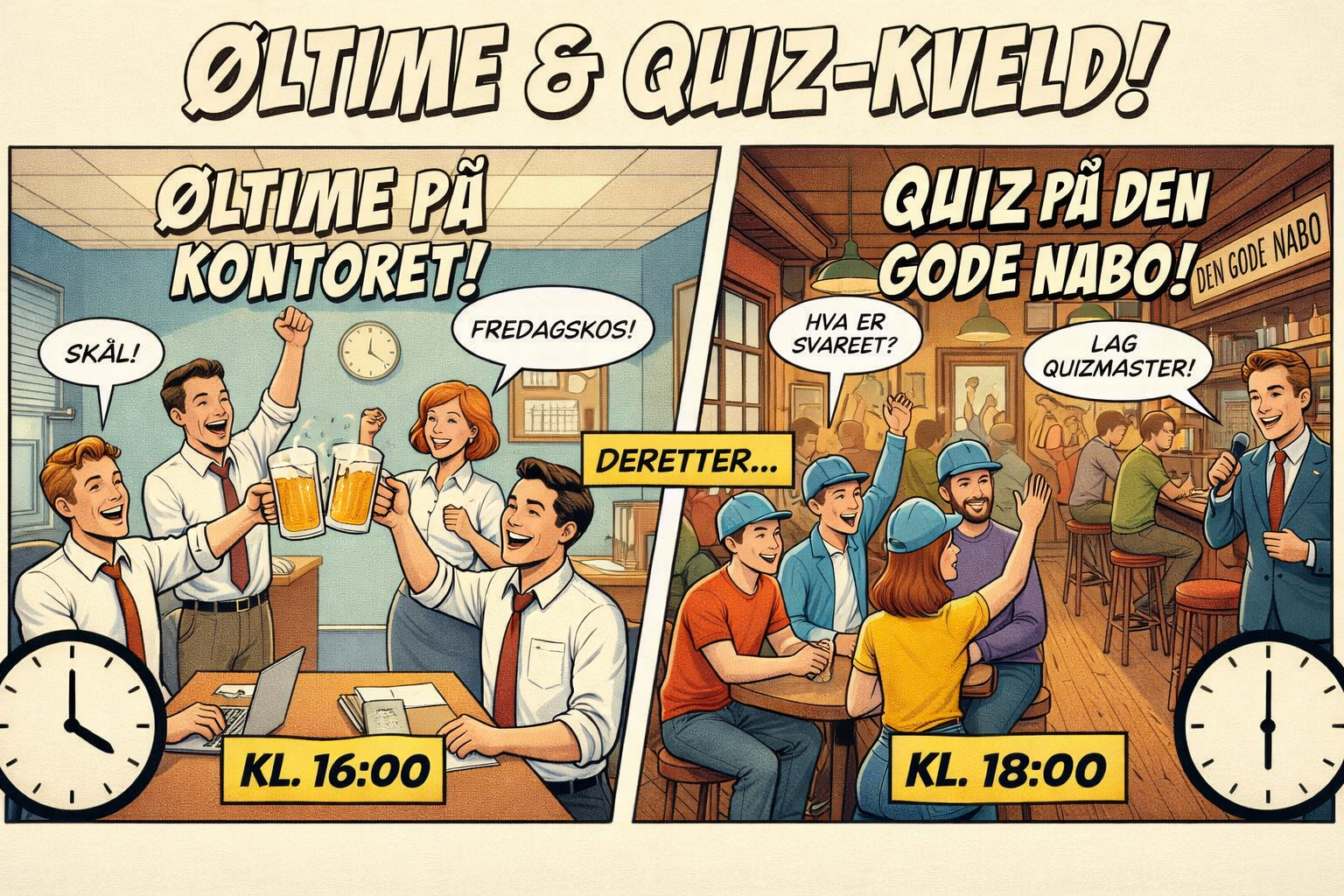 Bli med på øl-time på kontoret kl.16 og ta turen videre til den gode nabo for quiz kl. 18🍻